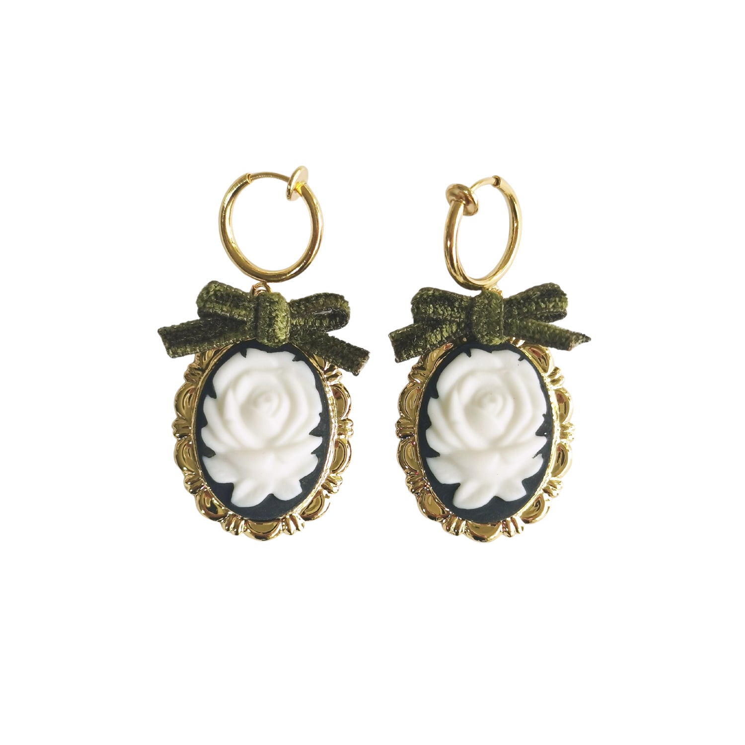 These rose cameo earrings are not only a fashion piece, but also an art piece. The cameos are carefully handcrafted and hand-painted from fine white porcelain. They experienced more than 15 hours kiln firing, with temperatures reaching over 1200°C. The earrings feature a dark romantic look with the black and gold tone finish and the highlighted olive green velvet ribbon bows. Clip-on version is also available.