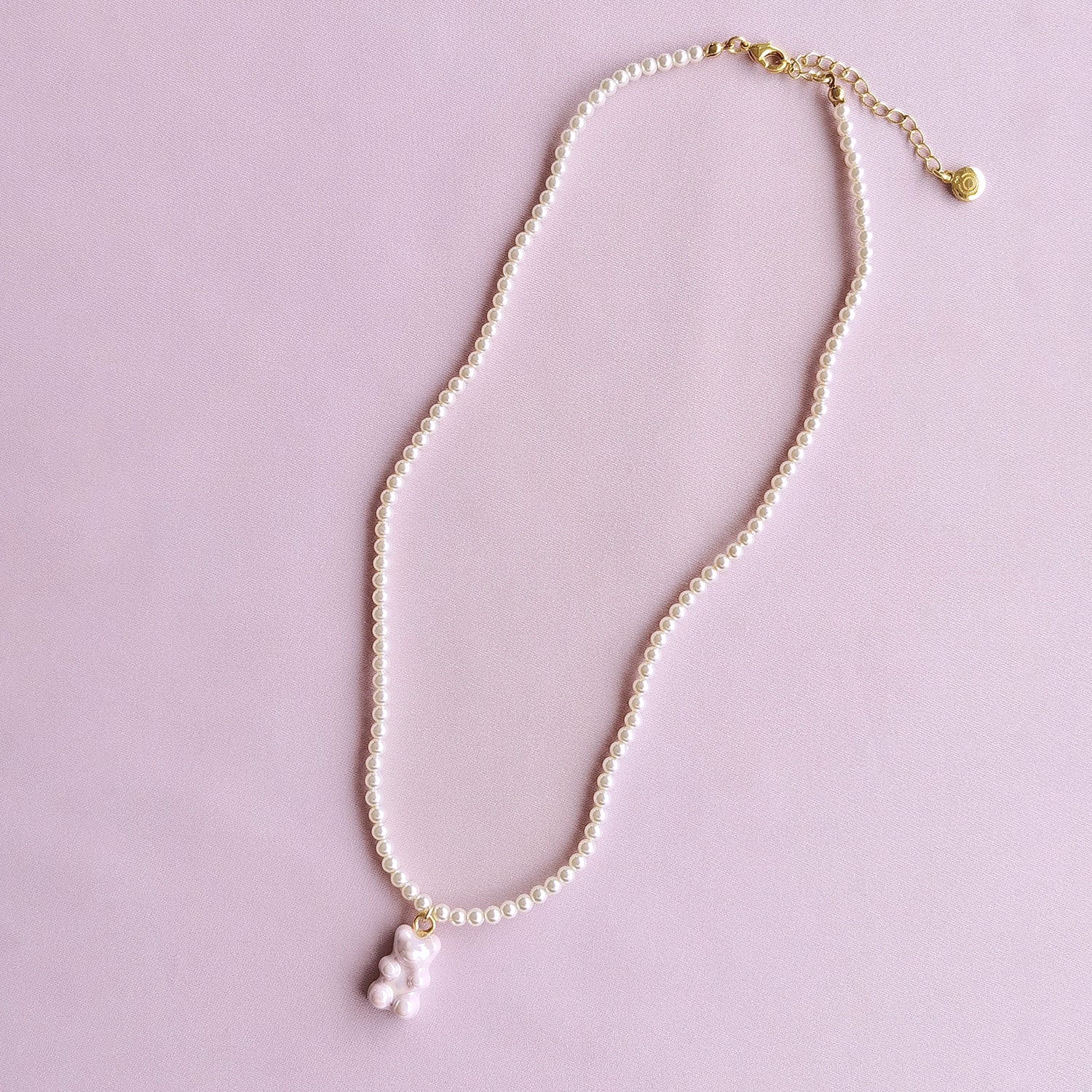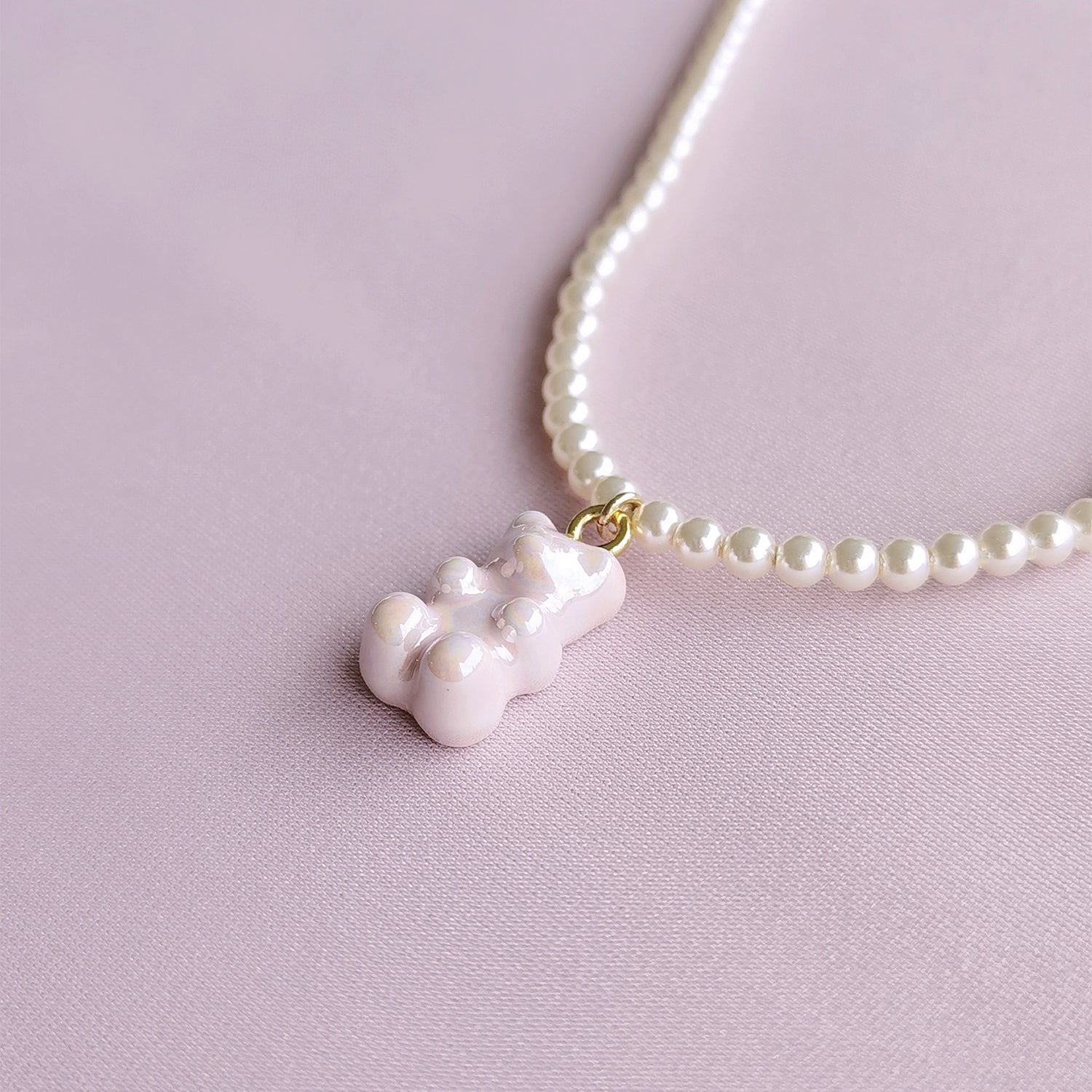 Sweet Pink Porcelain Gummy Bear Swarovski Pearl Necklace