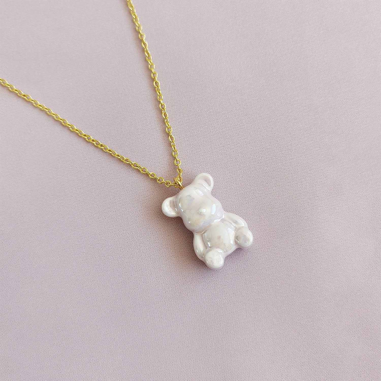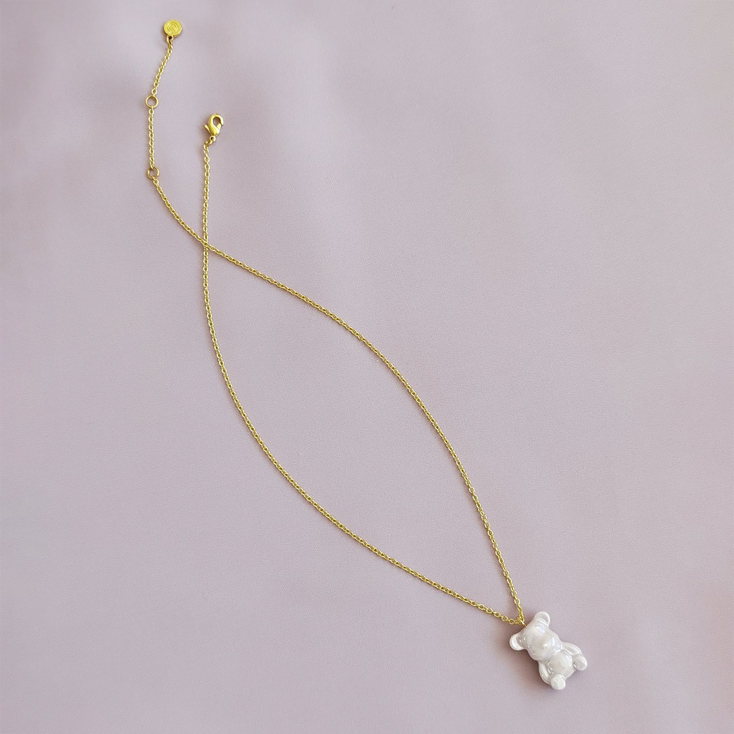 This teddy bear necklace is full of charm and crafted with care—each tiny bear is double-sided, with a sweet little face on both the front and the back, so you can adore them from every angle. Handmade in glossy porcelain and available in three dreamy colours—baby blue, sweet pink, and classy white with gold details—they strike the perfect balance between playfulness and polish. Whether you're layering it with other favourites or gifting someone a little joy, this necklace adds a soft and whimsical touch to any outfit. A tiny bear with a big heart, always ready to brighten your day.
